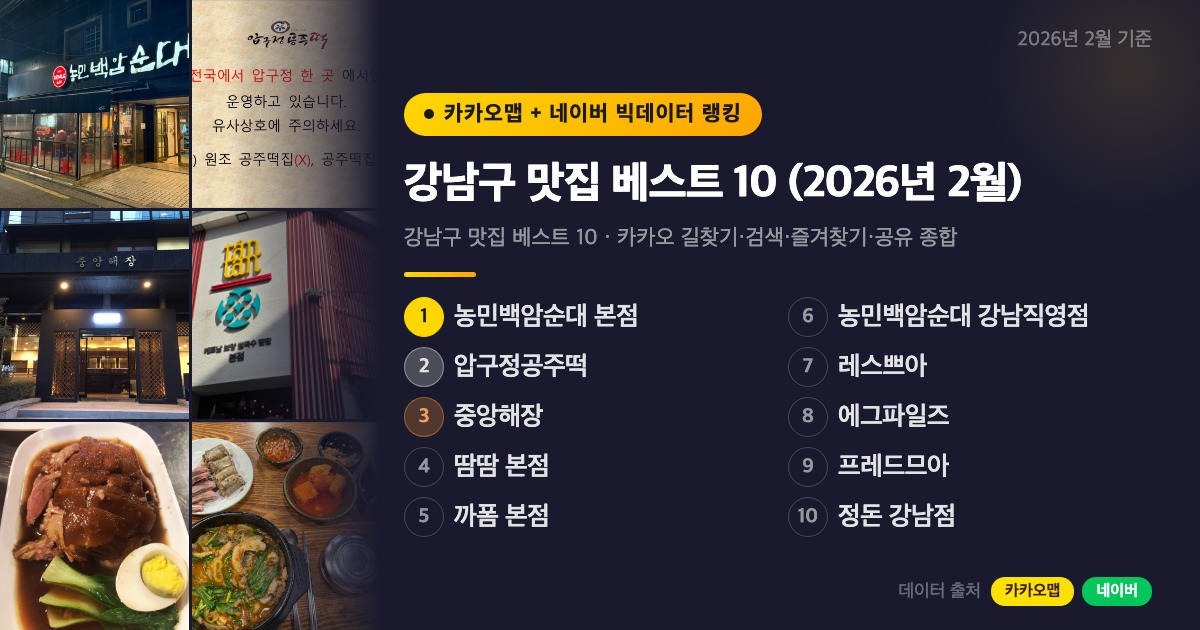 직장인 성지이자 트렌드의 중심인 강남구에는 수백 개의 맛집이 몰려 있어서 막상 어디를 가야 할지 고민되기 마련이에요. 이번 글에서는 카카오맵 길찾기, 검색, 즐겨찾기, 공유 데이터를 종합 점수화하고 네이버 플레이스 리뷰까지 교차 분석해 2026년 2월 기준 강남구 맛집 베스트 10을 선정했습니다. 오랜 단골들이 꾸준히 찾는 국밥집부터 요즘 SNS에서 화제가 된 베이커리까지, 장르를 가리지 않고 실제 데이터가 증명하는 강남 맛집들을 소개할게요.