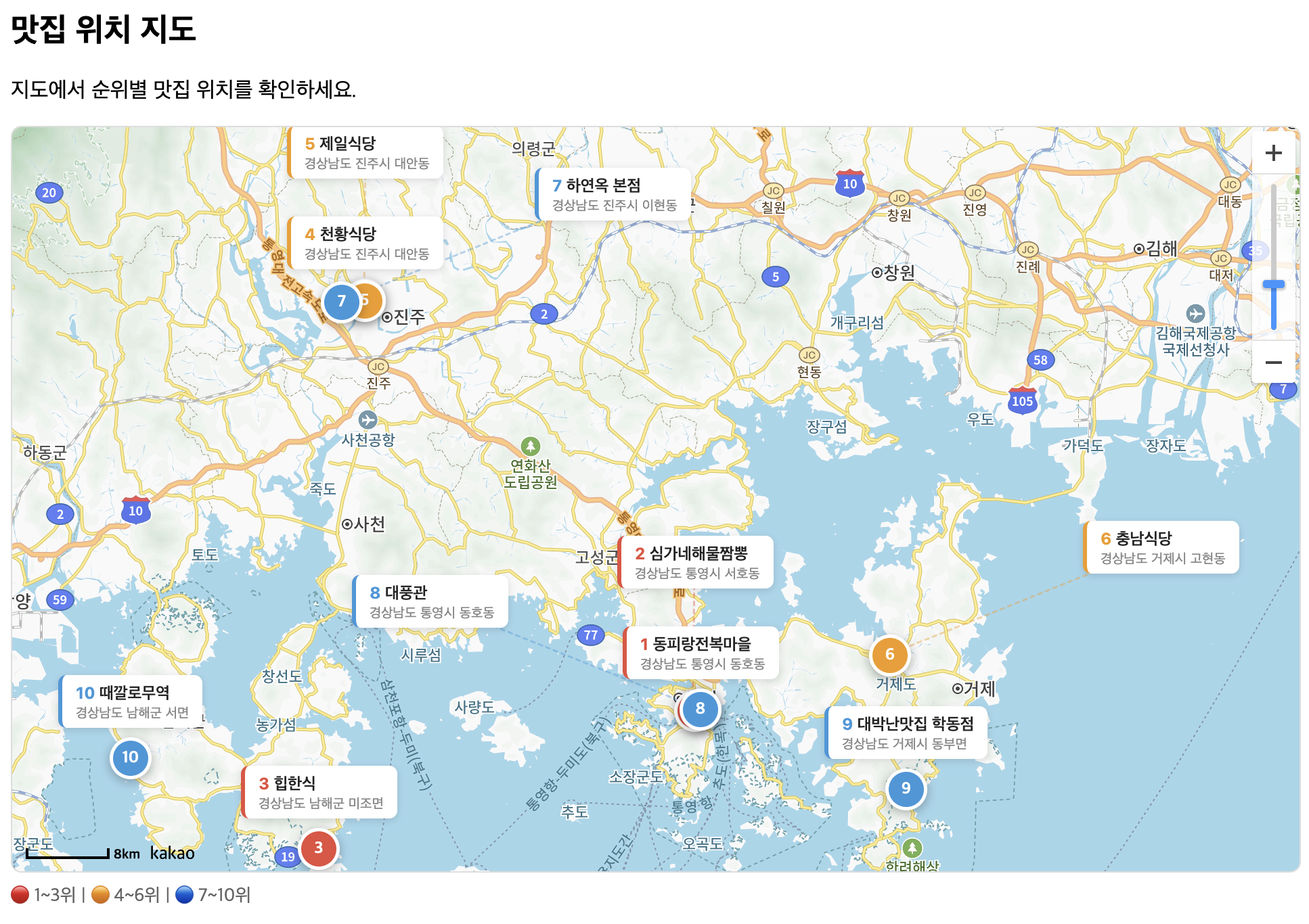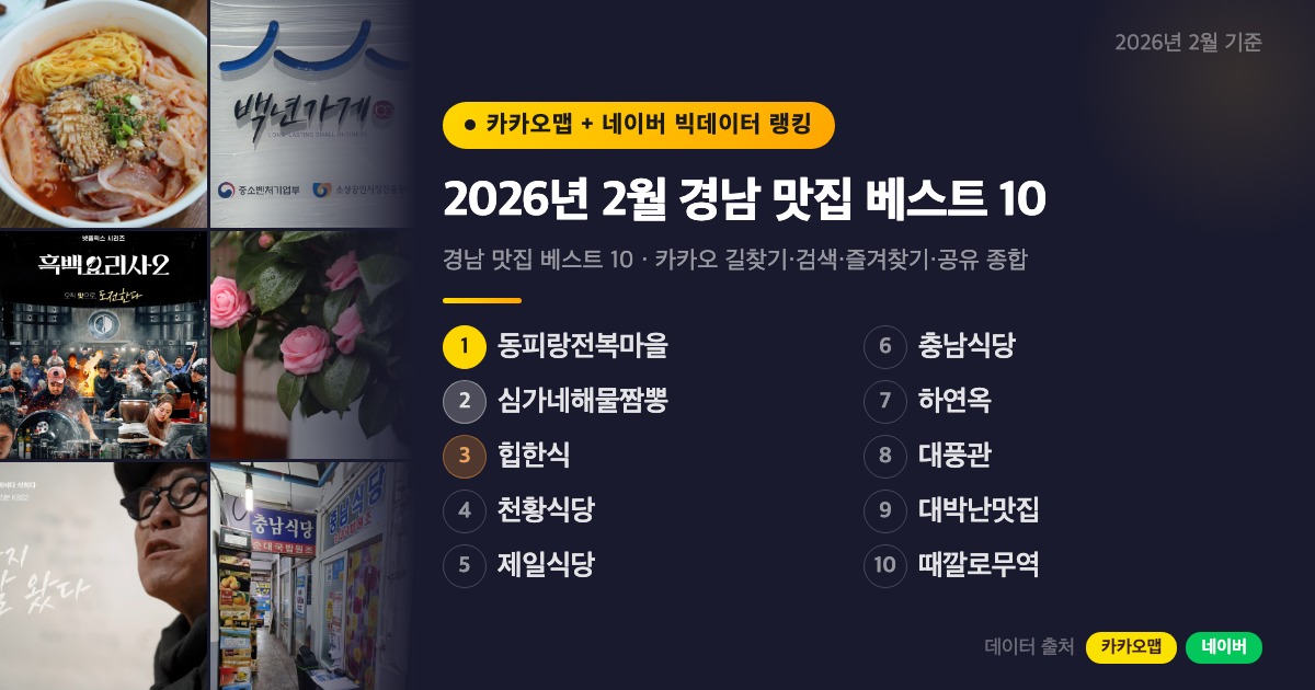 경상남도는 바다와 산이 공존하는 지역이라 먹거리가 다양한 게 특징이에요. 통영에서는 신선한 전복과 해산물을, 진주에서는 100년 전통의 냉면을, 창원에서는 진한 해물 짬뽕을 맛볼 수 있습니다. 카카오맵 길찾기·검색·즐겨찾기·공유 순위 종합으로 2026년 2월 경남 베스트 10을 정리해봤어요.
