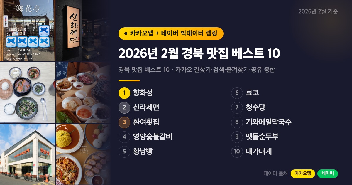 경상북도는 경주, 안동, 포항, 영주 등 역사와 자연이 살아 숨쉬는 도시들의 집합체예요. 경주 황리단길에서 한옥 분위기의 한식집을 발견하고, 영주에서 제대로 된 순두부를 맛보고, 포항에서 대게를 즐기는 게 경북 여행의 묘미입니다. 카카오맵 길찾기·검색·즐겨찾기·공유 순위 종합으로 2026년 2월 경북 베스트 10을 뽑아봤습니다.