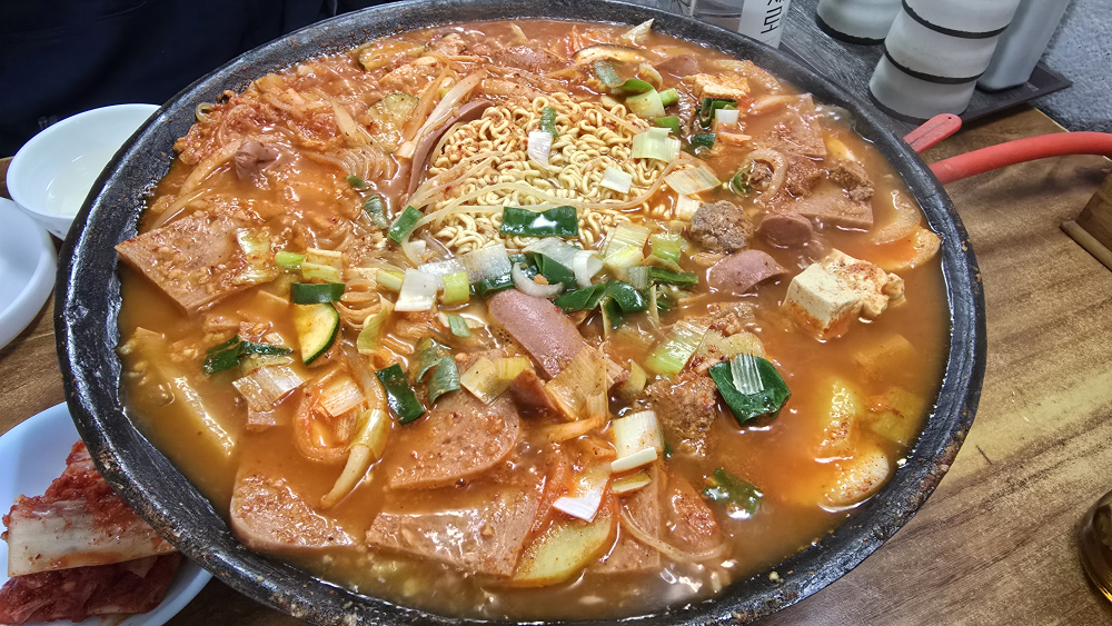 18년째 블루리본을 받아온 찐맛집으로, 쫄면사리와 버섯, 무 등 평소 부대찌개에서 보기 힘든 재료가 들어가 전골에 가까운 묵직한 맛을 냅니다. 라면사리를 주문하면 쫄면사리도 함께 넣어주는 서비스가 있고, 공기밥이 포함되어 있어 가성비도 뛰어납니다. 족발과 부대찌개를 함께 시켜 먹는 조합을 현지인들이 특히 추천합니다.