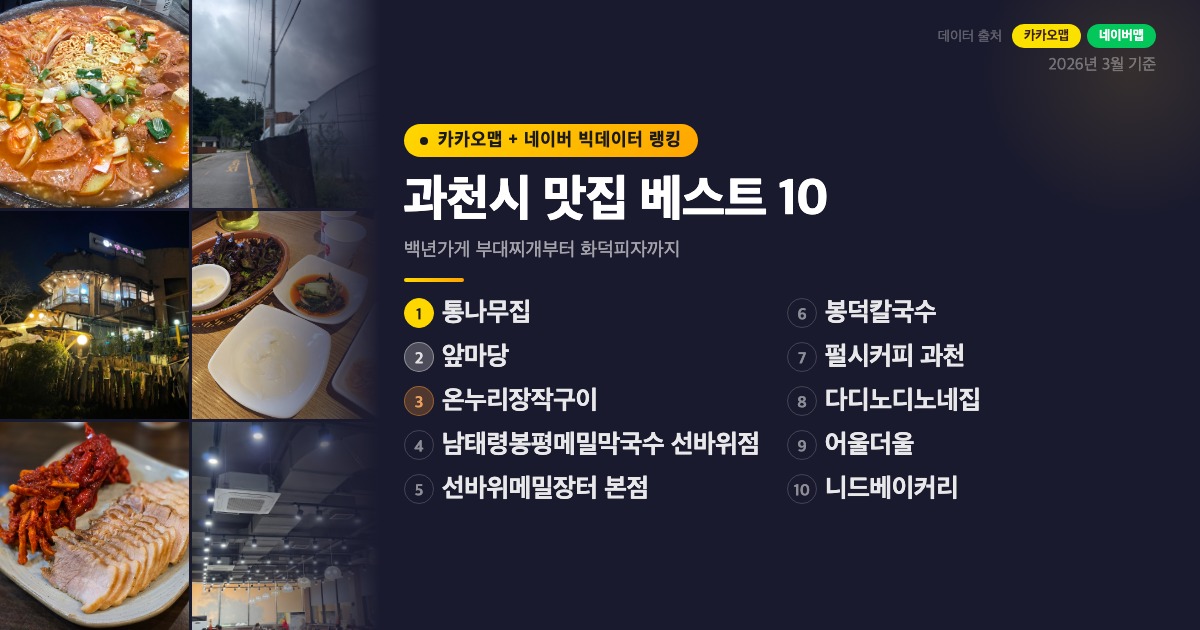 경마공원과 서울대공원, 그리고 관악산 자락을 품은 과천은 수도권 나들이 명소로 유명하지만, 정작 오래된 노포부터 감각적인 카페까지 알찬 맛집이 즐비한 동네이기도 합니다. 이번 글은 카카오맵 빅데이터 길찾기, 검색, 즐겨찾기, 공유 순위를 종합 점수화해 과천에서 실제로 사람들이 가장 많이 찾는 곳들을 추렸습니다. 오래 사랑받아온 노포 맛집부터 최근 뜨고 있는 카페와 이탈리안 레스토랑까지, 과천 현지인이 인정한 맛집 10곳을 소개합니다.