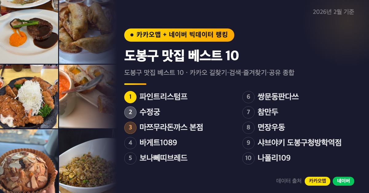 도봉구는 북한산 자락과 도봉산을 품고 있어 자연과 가까운 동네 특유의 아늑한 분위기가 있는 곳이에요. 그러면서도 창동역, 쌍문역, 방학역 주변으로 오랜 단골 맛집부터 최근 SNS에서 입소문 난 신흥 맛집까지 다양하게 자리잡고 있더라고요. 이번에는 카카오맵의 길찾기, 검색, 즐겨찾기, 공유 네 가지 빅데이터를 종합 점수화해서 2026년 2월 기준으로 도봉구에서 실제로 가장 많이 찾는 맛집 10곳을 추려봤습니다.