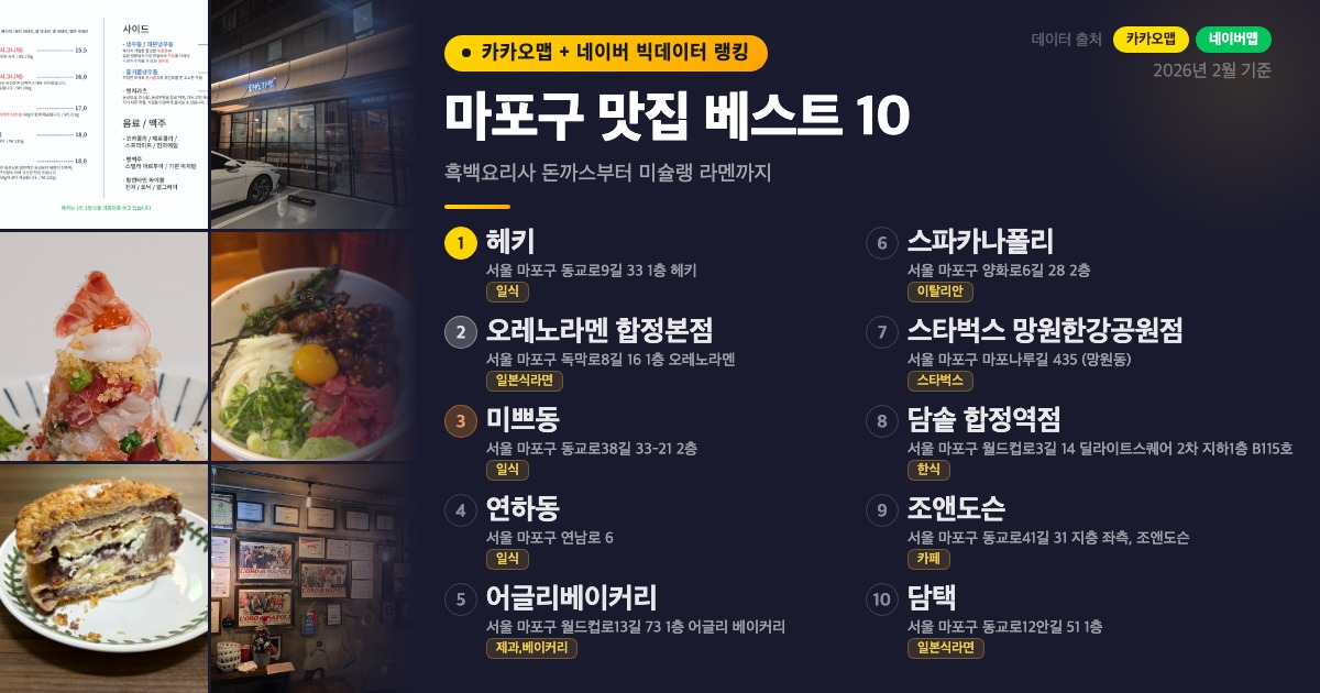 홍대, 합정, 연남동, 망원동까지 개성 넘치는 동네들이 촘촘히 이어진 마포구는 서울에서도 손꼽히는 맛집 격전지입니다. 이번 달에는 카카오맵 빅데이터의 길찾기·검색·즐겨찾기·공유 네 가지 랭킹을 종합 점수화해서 2026년 2월 기준으로 마포구에서 실제로 사람들이 가장 많이 찾고, 저장하고, 공유한 맛집 열 곳을 추려봤습니다. 방송에 등장한 화제의 가게부터 동네 단골들만 알던 숨은 맛집까지, 직접 발품 팔아 확인한 생생한 정보를 담아봤으니 마포구 방문 전에 꼭 참고해 보세요.