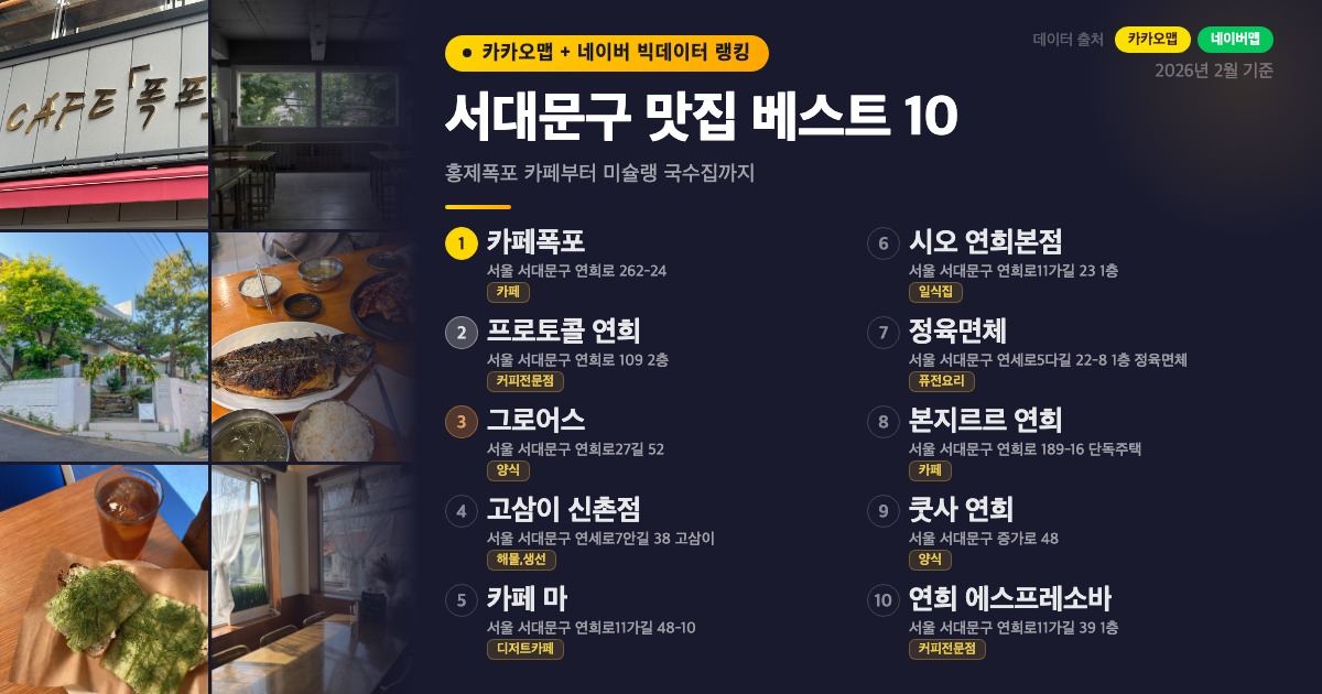 연희동 골목길과 홍제천 산책로를 품은 서대문구는 조용한 주택가 사이사이에 개성 넘치는 맛집과 카페가 숨어 있는 동네입니다. 화려한 번화가보다는 동네 단골들이 묵묵히 찾는 진짜 맛집들이 많은 곳이기도 하죠. 이번에는 카카오맵 빅데이터(길찾기·검색·즐겨찾기·공유 순위)를 종합 점수화해서 서대문구에서 실제로 가장 많이 검색되고 저장되는 곳들을 뽑아봤습니다. 카페부터 생선구이, 브런치, 일식까지 장르도 다양하니 방문 목적에 맞게 참고해 보세요.