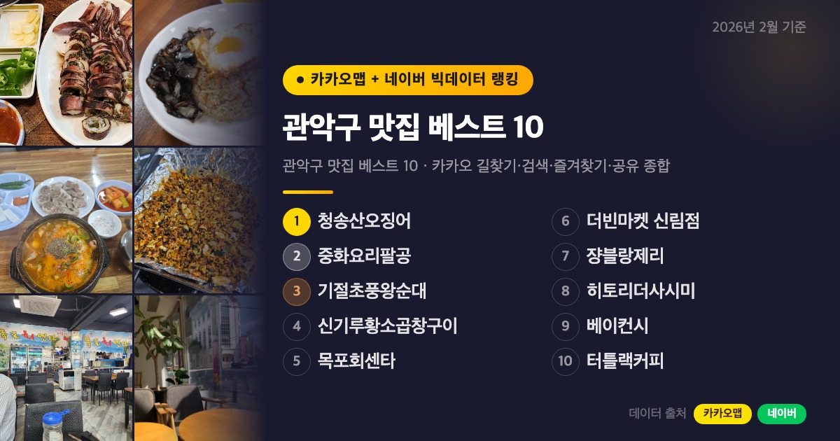 서울대입구역과 신림역을 중심으로 다양한 먹거리가 몰려 있는 관악구는 학생부터 직장인, 동네 주민까지 층층이 두터운 단골을 거느린 개성 강한 맛집들이 많기로 유명합니다. 이번에 소개할 열 곳은 카카오맵의 길찾기, 검색, 즐겨찾기, 공유 데이터를 종합 점수로 환산하고, 네이버 리뷰까지 더해 2026년 2월 기준으로 가장 주목받고 있는 곳들만 추렸습니다.